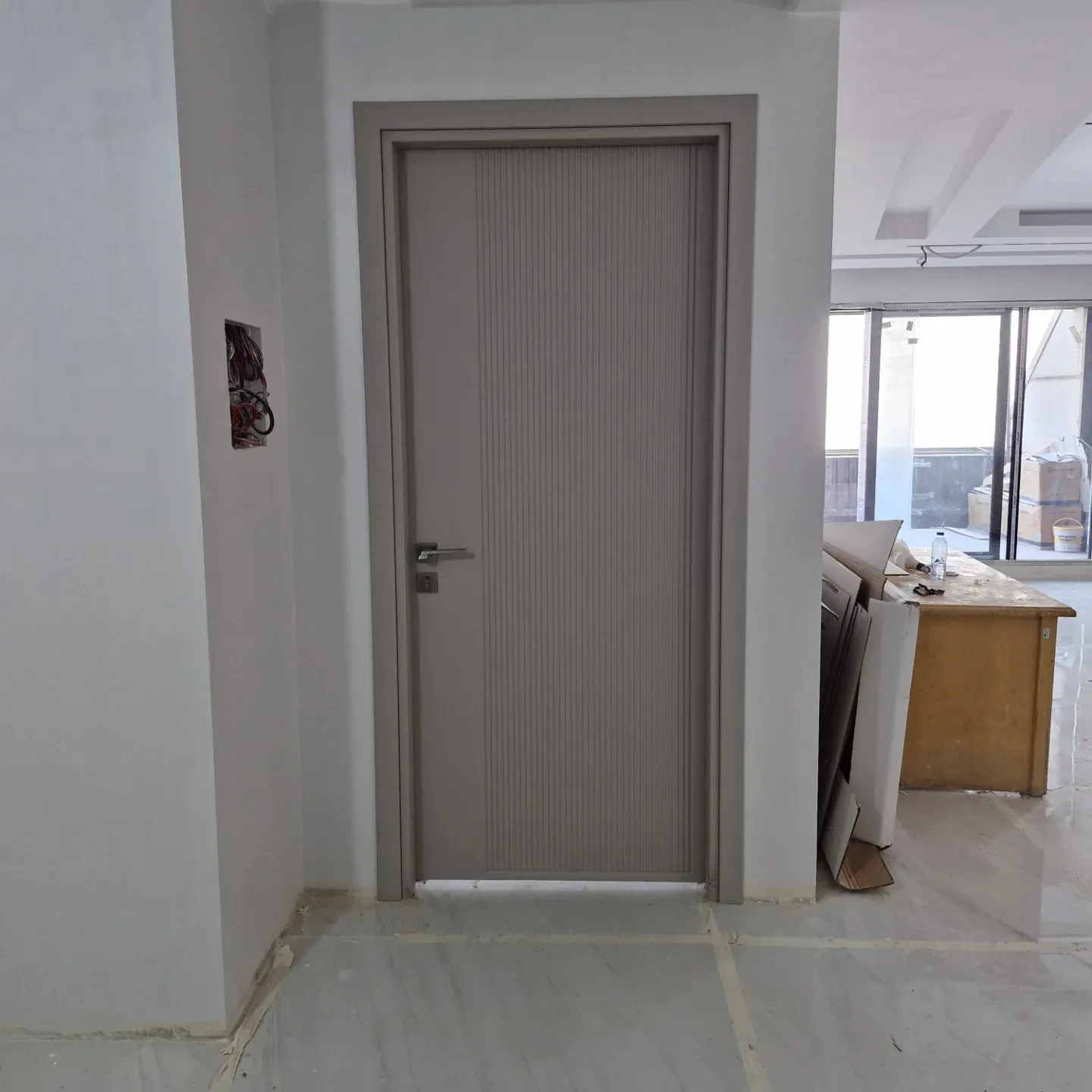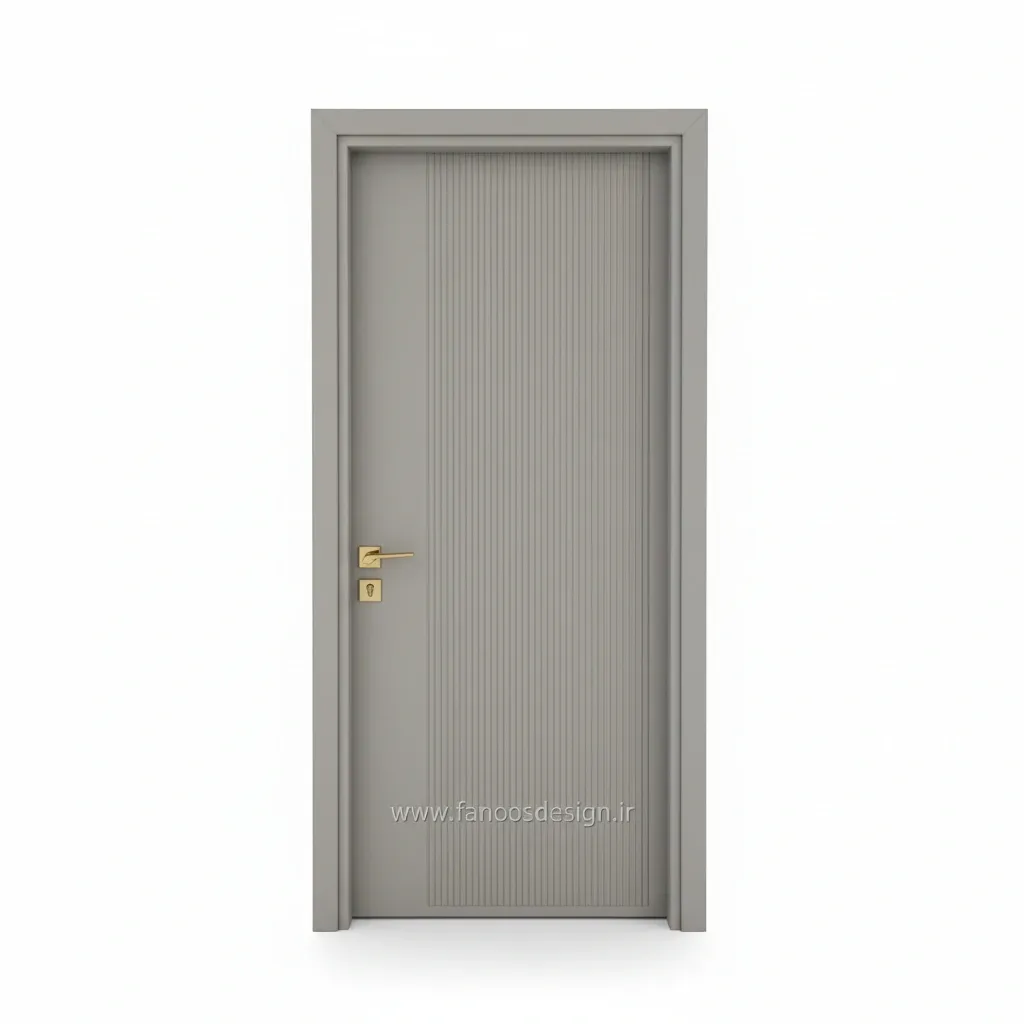 درب اتاقی طوسی مدرن با طراحی ساده و خطوط عمودی برجسته، انتخابی ایدهآل برای فضاهای مینیمال و لوکس است.