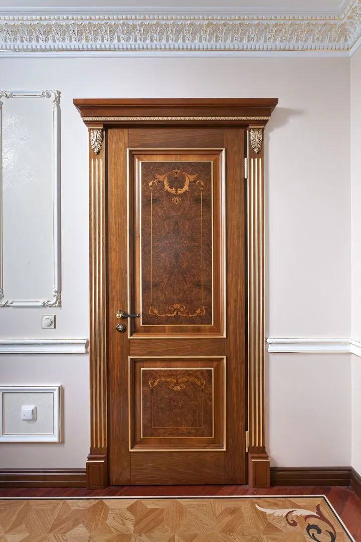 درب مدل آتریا، شاهکاری از هنر منبتکاری و طراحی کلاسیک است که با استفاده از چوب طبیعی و پرداخت براق، جلوهای لوکس و اصیل به فضای داخلی شما میبخشد. قاب اطراف درب با ستونهای شیاردار و سرستونهای برگ آکانتوس، الهامگرفته از معماری کلاسیک یونان و رم است.