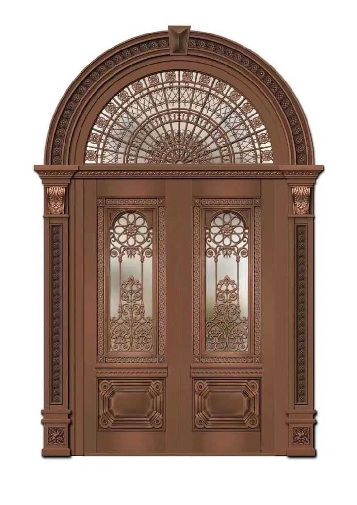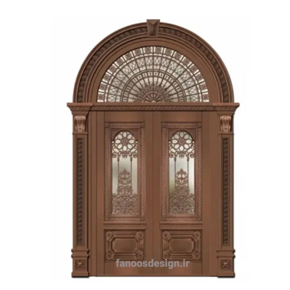 درب ورودی دو لنگه لوکس مدل کلاسیک با پنجره قوسی و نقش‌برجسته برنزی کد 30367