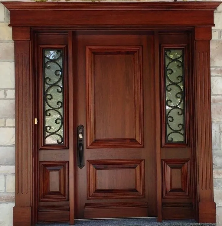 این درب با تلفیق چوب تیره و سنگ روشن اطراف، تضادی چشمنواز ایجاد کرده که توجه هر بینندهای را جلب میکند. طراحی برجسته قاب بالا و پنلهای جانبی با شیشه مات، حس امنیت و زیبایی را همزمان منتقل میکند.