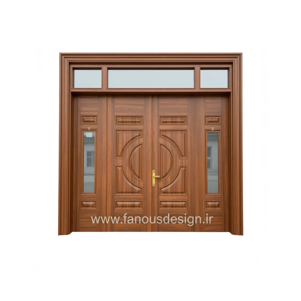 این درب چوبی دو لنگه با طراحی کلاسیک و جزئیات معماری چشمنواز، انتخابی بینظیر برای ورودی ساختمانهای مسکونی، ویلایی و تجاری است. قاب ستوندار، پنلهای شیشهای جانبی و پنجره ترنسوم مثلثی، جلوهای باشکوه و سلطنتی به فضا میبخشند.