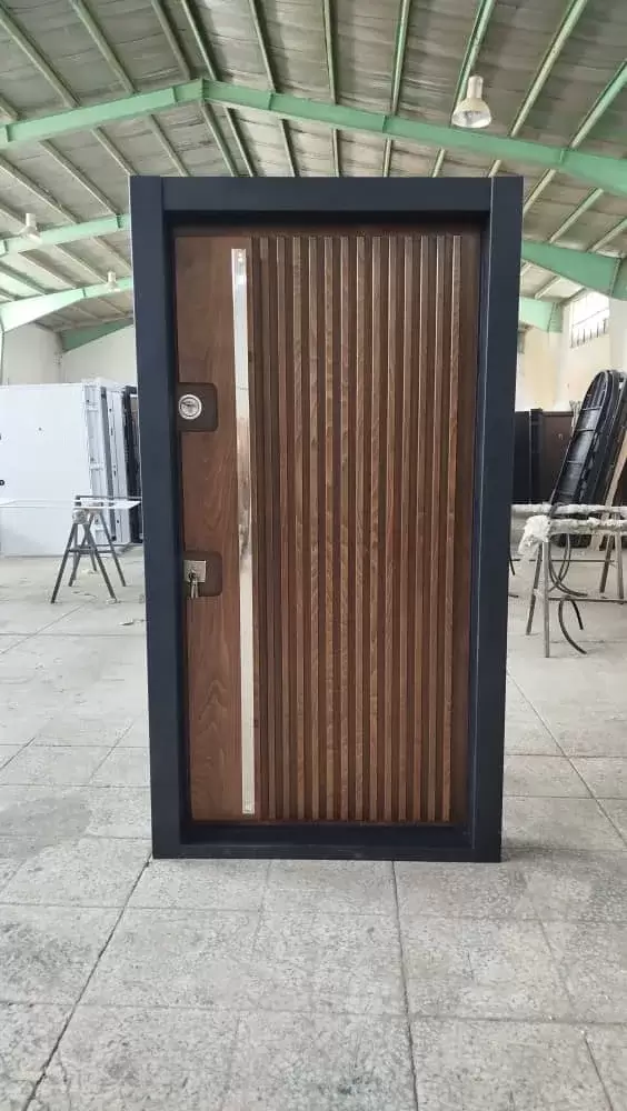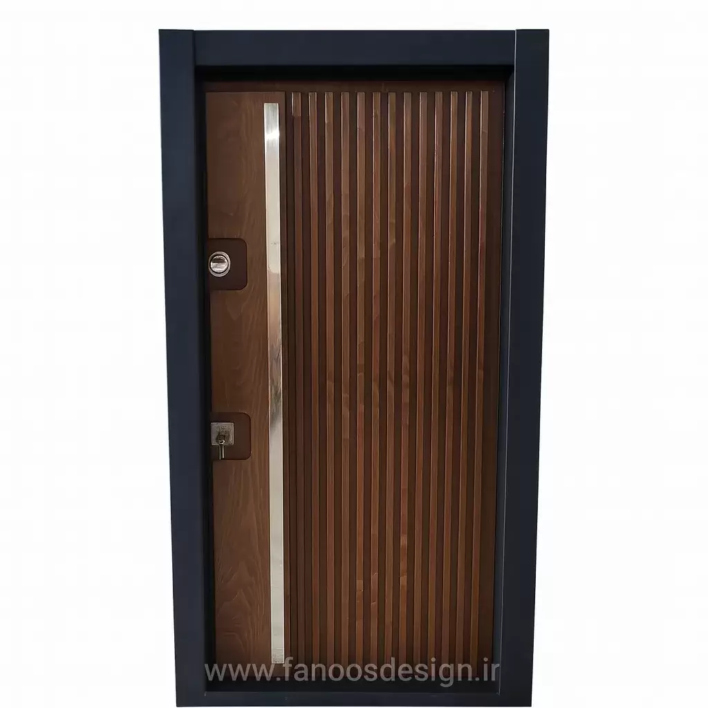 اگر به دنبال درب ضد سرقت مدرن با ترکیبی از زیبایی و استحکام هستید، این مدل از محصولات فانوس دیزاین انتخابی بینظیر برای شماست. طراحی شیارهای عمودی روی سطح درب، جلوهای لوکس و امروزی ایجاد کرده که با رنگ گرم چوب طبیعی و قاب مشکی فلزی ترکیب شده است.