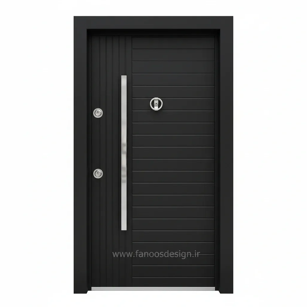 درب ضد سرقت بلکلاین با طراحی مشکی مات، ترکیبی از امنیت، زیبایی و دوام را به فضای ورودی شما هدیه میدهد. این درب با دستگیره عمودی استیل و کوبه گرد کلاسیک، جلوهای خاص و مدرن به محیط میبخشد.
