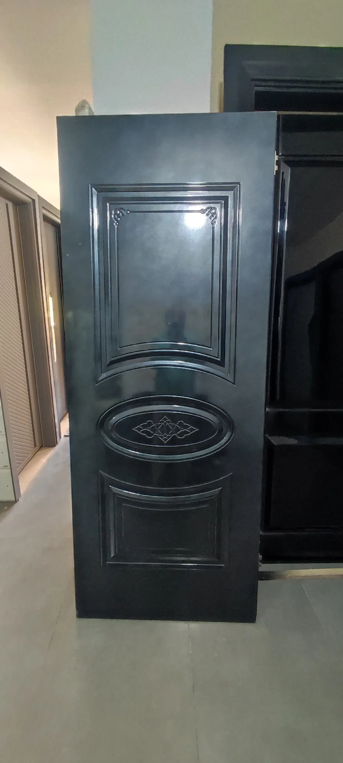 این مدل درب کلاسیک با رنگ مشکی براق و قابهای برجسته، جلوهای فاخر و چشمگیر دارد.