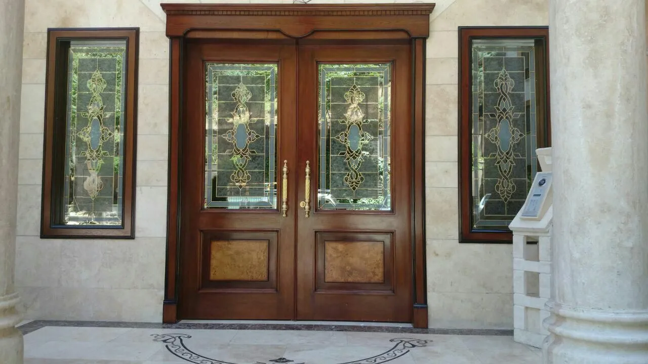ترکیب شیشههای دکوراتیو با قاب چوبی برجسته، حس شکوه، امنیت و اصالت را به فضا منتقل میکند.