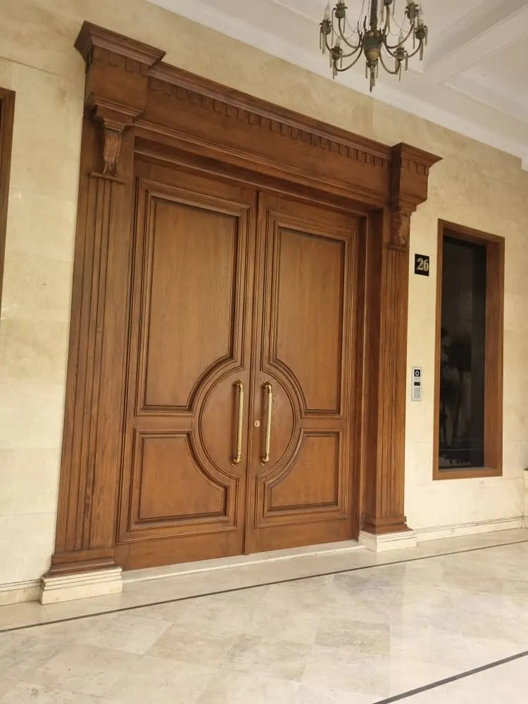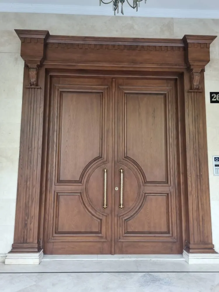 این مدل درب چوبی کلاسیک دو لنگه با طراحی فاخر و ظرافت در جزئیات، یکی از محبوبترین گزینهها برای ورودی ساختمانهای لوکس و ویلاهای خاص است.