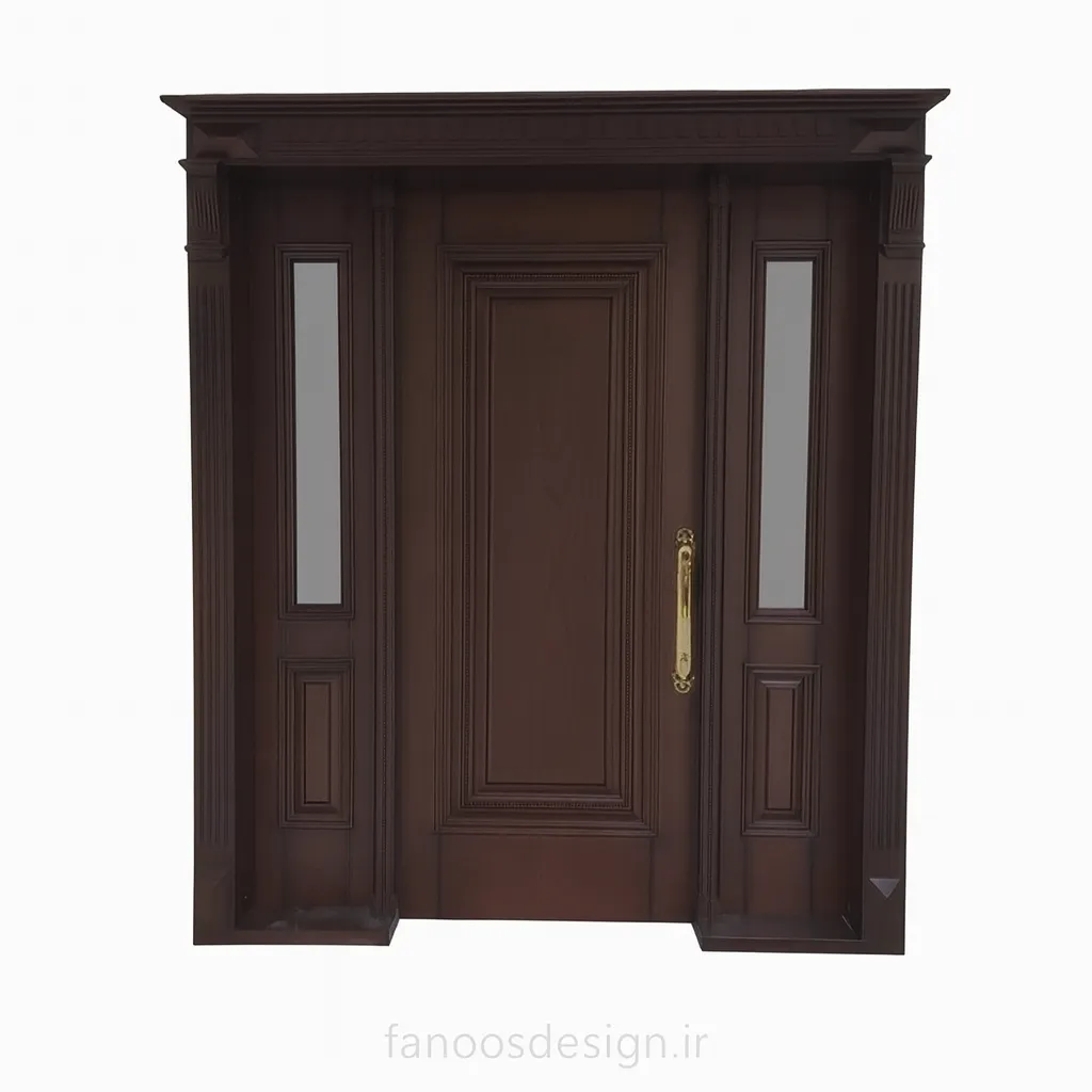 این مدل درب چوبی کلاسیک با قاب و ستونهای جانبی، یکی از خاصترین طرحهای لوکس مجموعه فانوس دیزاین است.
