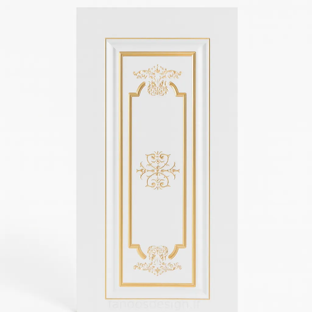 طراحی این درب با الهام از معماری کلاسیک اروپا انجام شده است. قابهای برجسته، خطوط طلایی و نقوش ظریف گچی، آن را به انتخابی ممتاز برای دکوراسیونهای لوکس و رمانتیک تبدیل میکند. ترکیب رنگ سفید و طلایی حس روشنایی، پاکی و شکوه را همزمان القا میکند.
