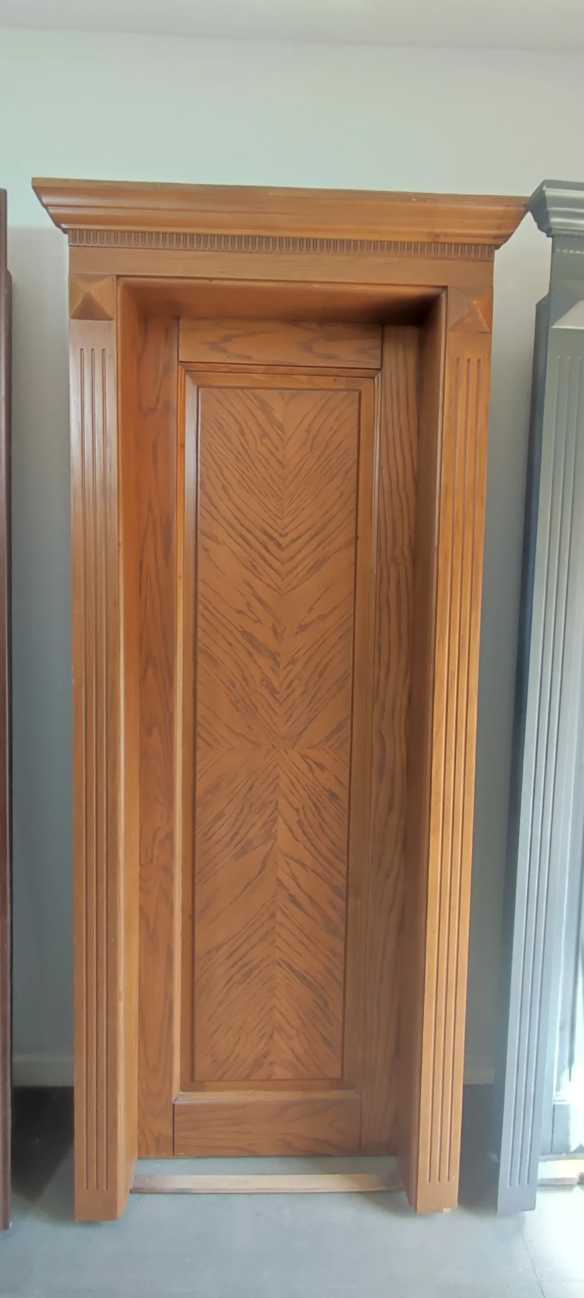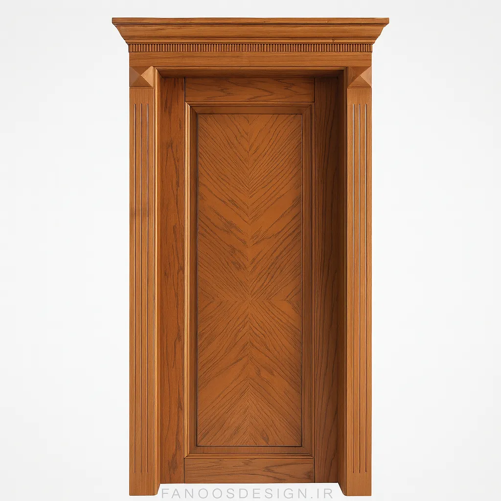 طرح زیبای چوب طبیعی در کنار قاب برجسته و تاج کلاسیک در بالای درب، جلوهای مجلل و چشمگیر ایجاد کرده که برای فضاهای لوکس و خاص بسیار مناسب است.