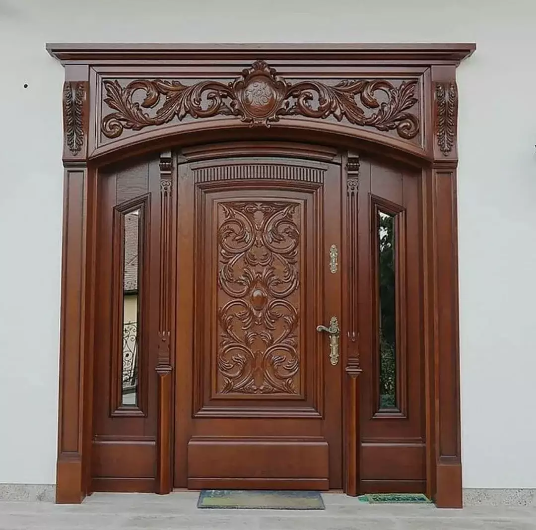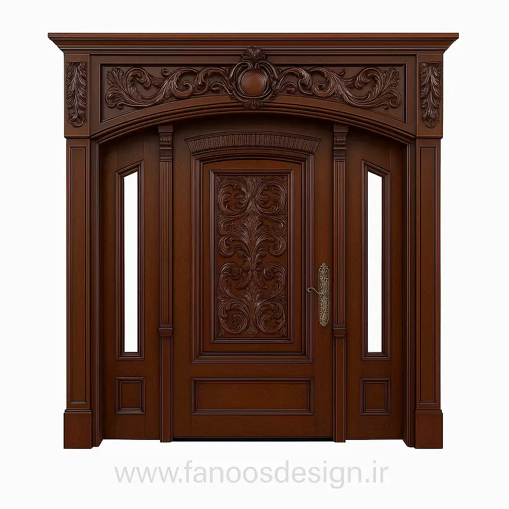 این مدل از درب ورودی کلاسیک با طراحی منبتکاریشده و تاج برجسته، جلوهای باشکوه و سلطنتی به ورودی ساختمان شما میبخشد.