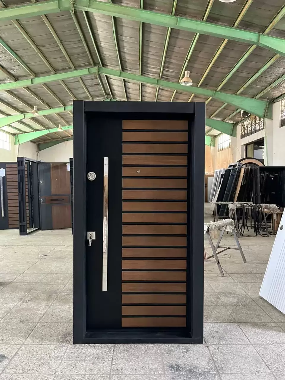 این مدل درب، مناسب ورودی واحدهای لوکس، درب لابی مدرن و پروژههای ساختمانی خاص است. ترکیب چوب گرم با فلز مشکی، تعادل زیبایی و قدرت را در طراحی داخلی و خارجی ساختمان برقرار میکند.