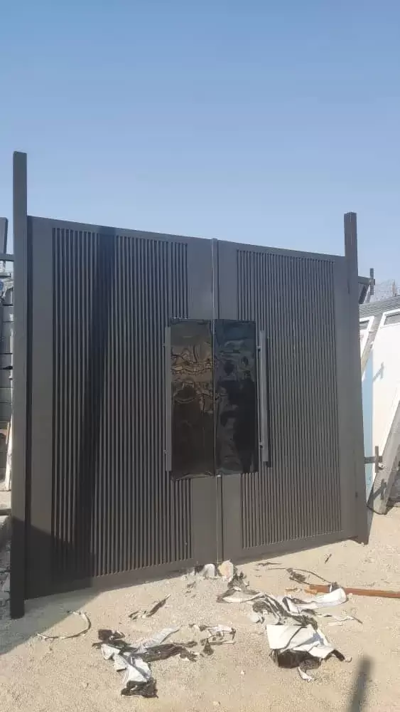 درب حیاط آهنی مدرن دو لنگه طرح کرکرهای با شیشه مشکی وسط