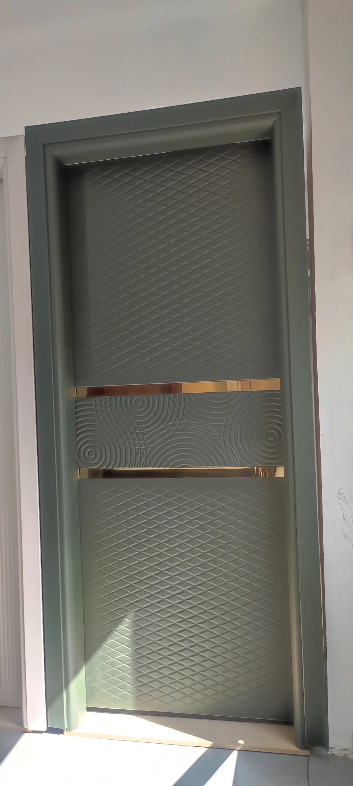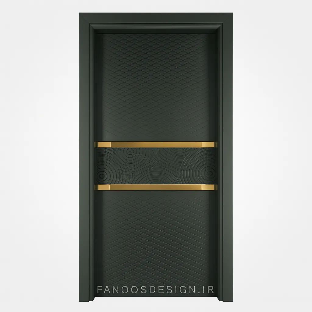 این مدل درب مدرن با رنگ طوسی مات و دو نوار طلایی براق، جلوهای لوکس و خاص به ورودی منزل یا آپارتمان شما میبخشد.