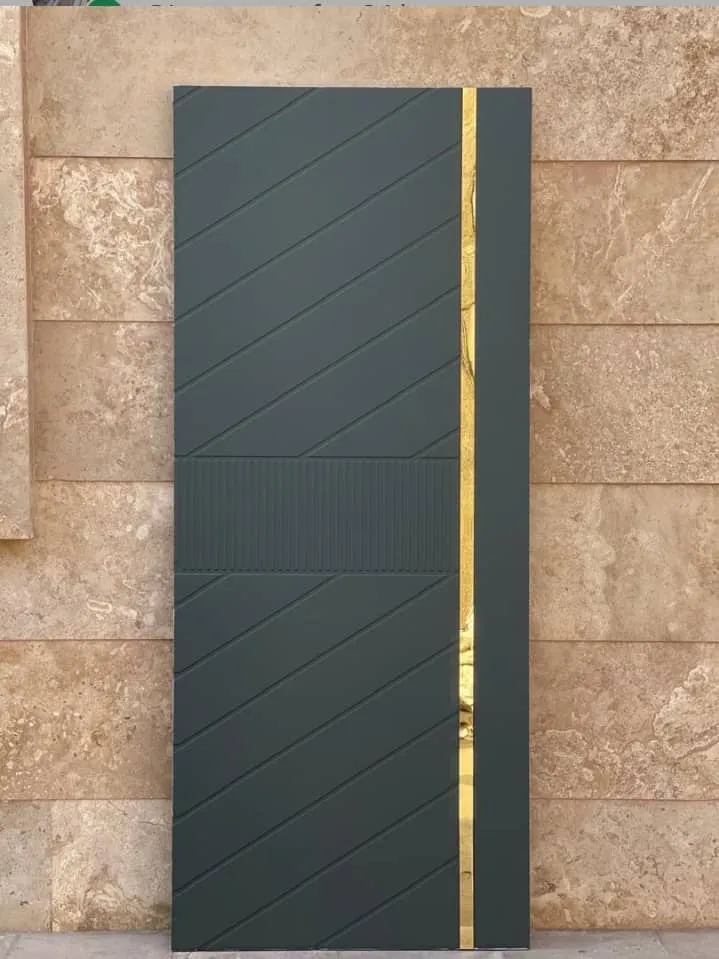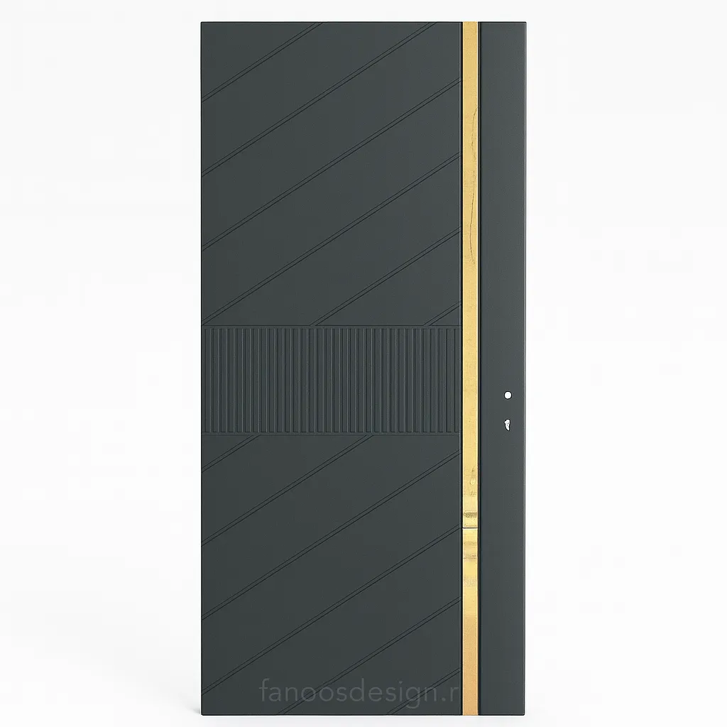 این مدل درب برای فضاهای لوکس مانند اتاقخواب مستر، دفاتر مدیریتی و ورودی واحدهای مسکونی مدرن بسیار مناسب است. رنگ طوسی حس آرامش و هماهنگی را القا کرده و نوار طلایی حس اشرافیت و برجستگی را به طراحی اضافه میکند.
