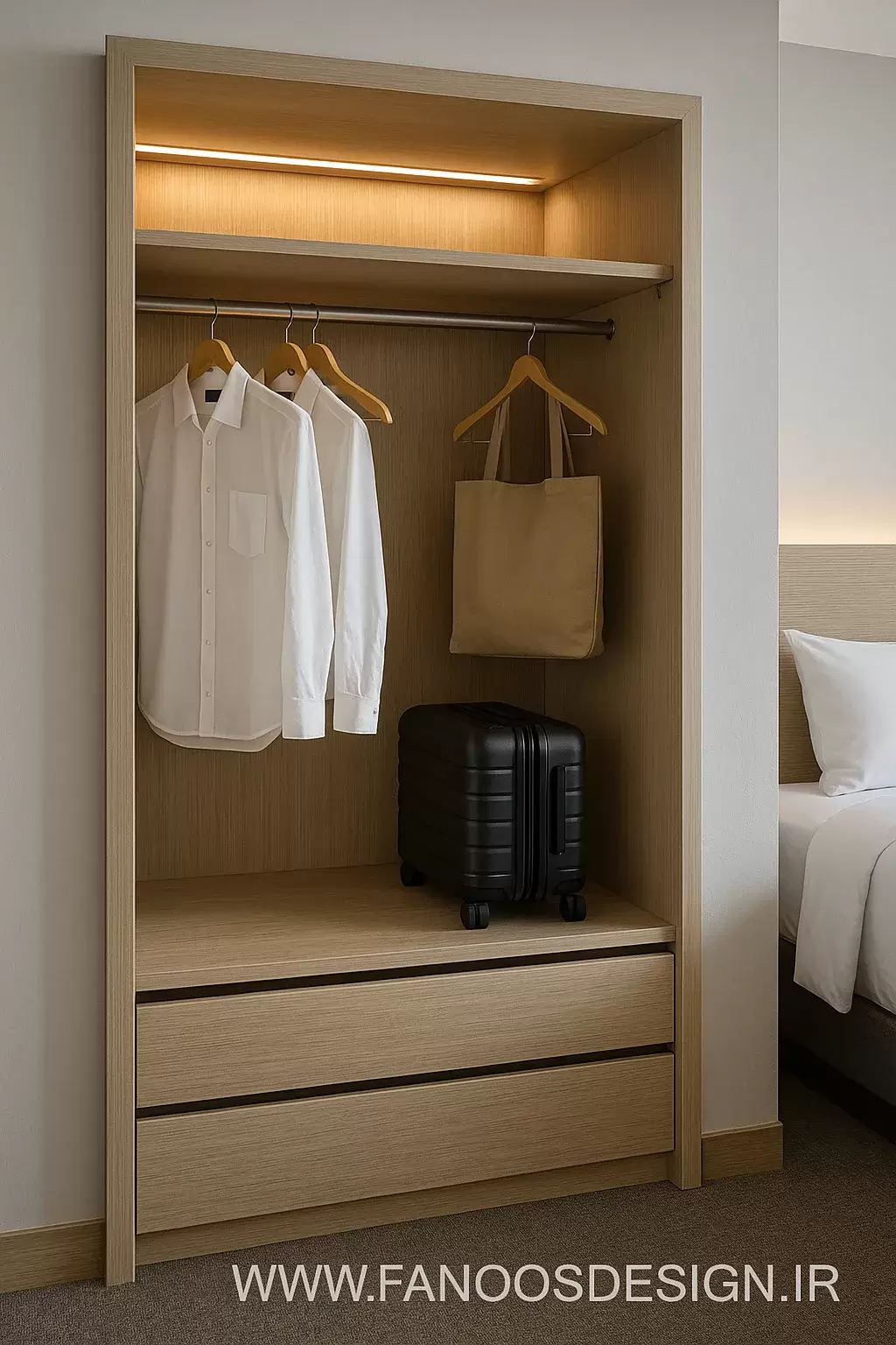 این کمد دیواری مدرن با خطوط صاف و روکش چوب روشن، برای اتاقهای هتل مدرن و بیزینسی طراحی شده است.
