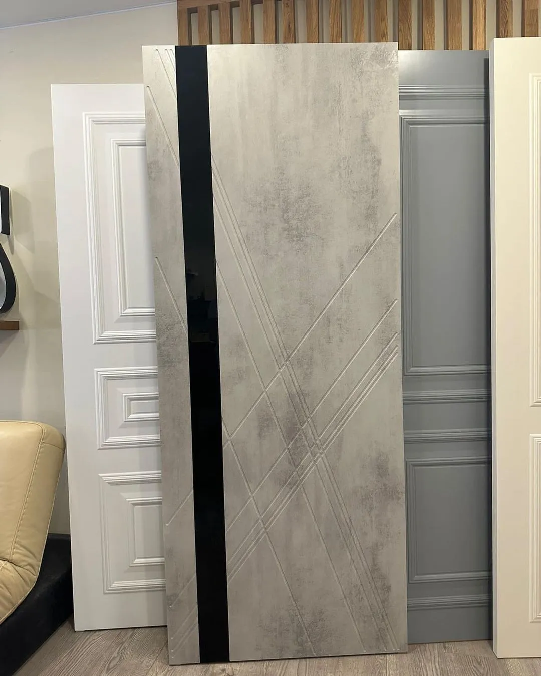 درب Concrete Line ترکیبی از طراحی مدرن و بافت صنعتی است که با سطحی بتنمانند، خطوط مورب هندسی و نوار مشکی عمودی، جلوهای منحصربهفرد به فضای داخلی شما میبخشد.