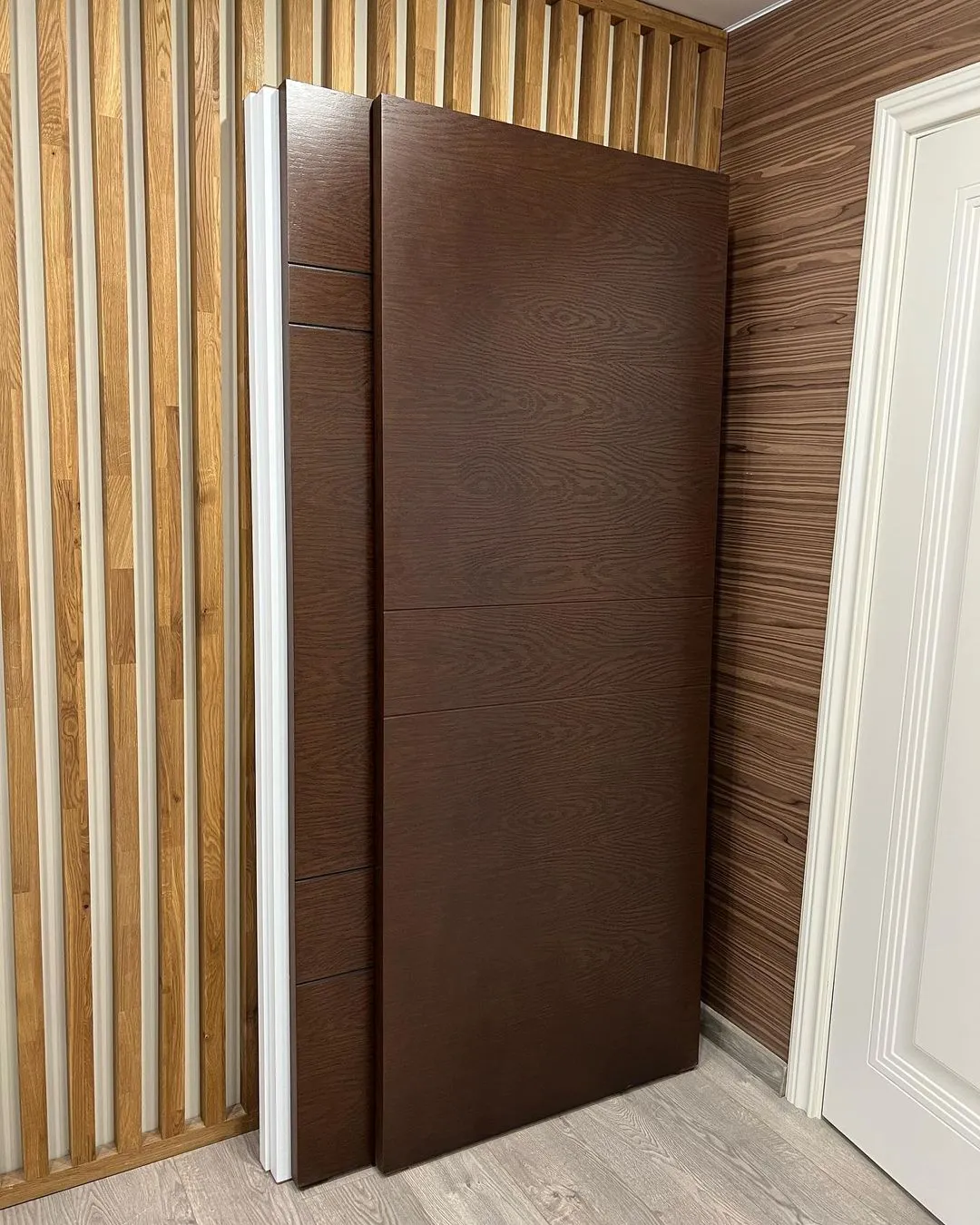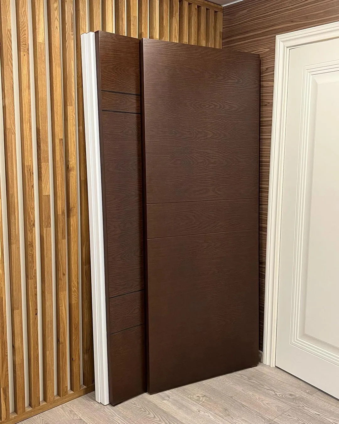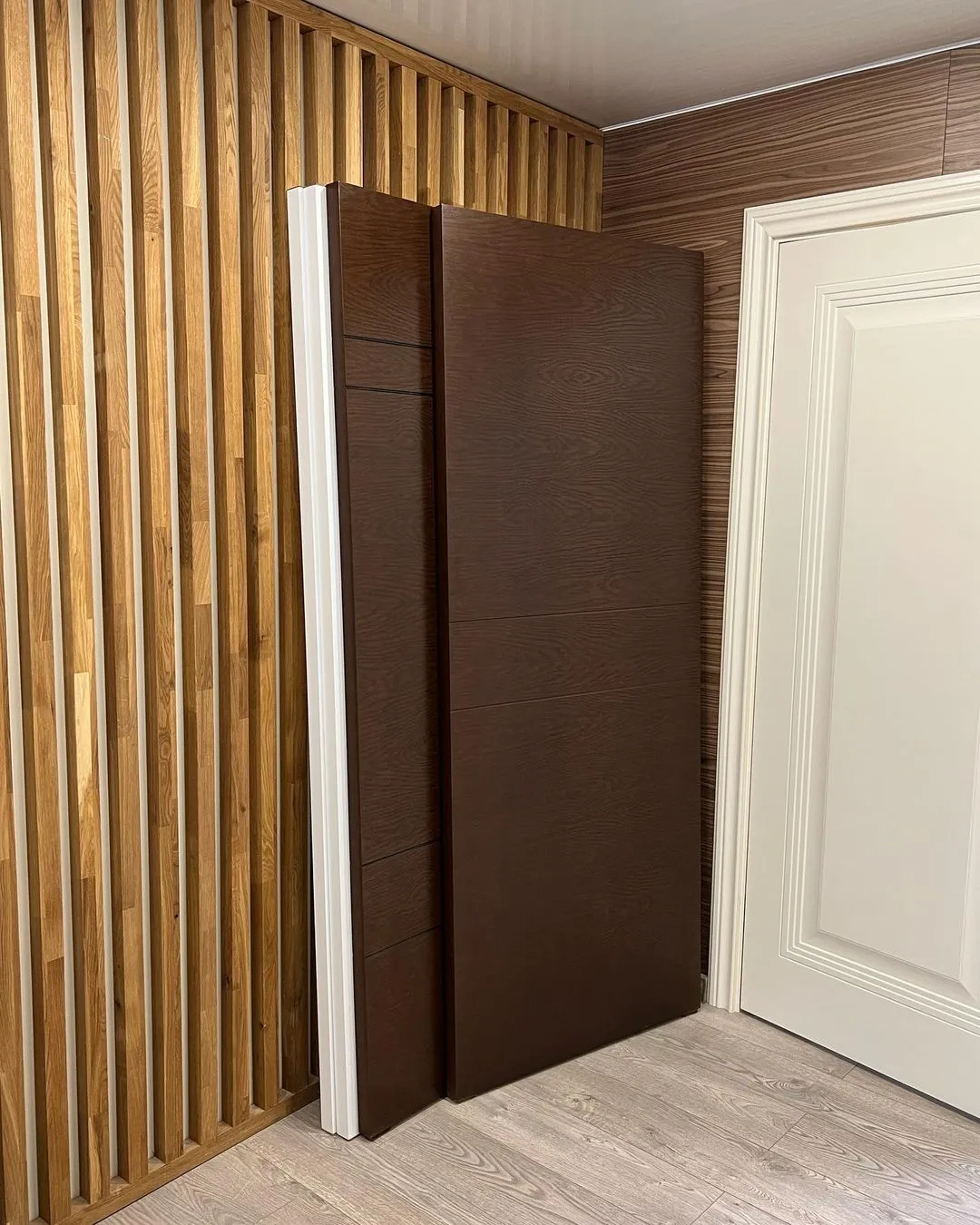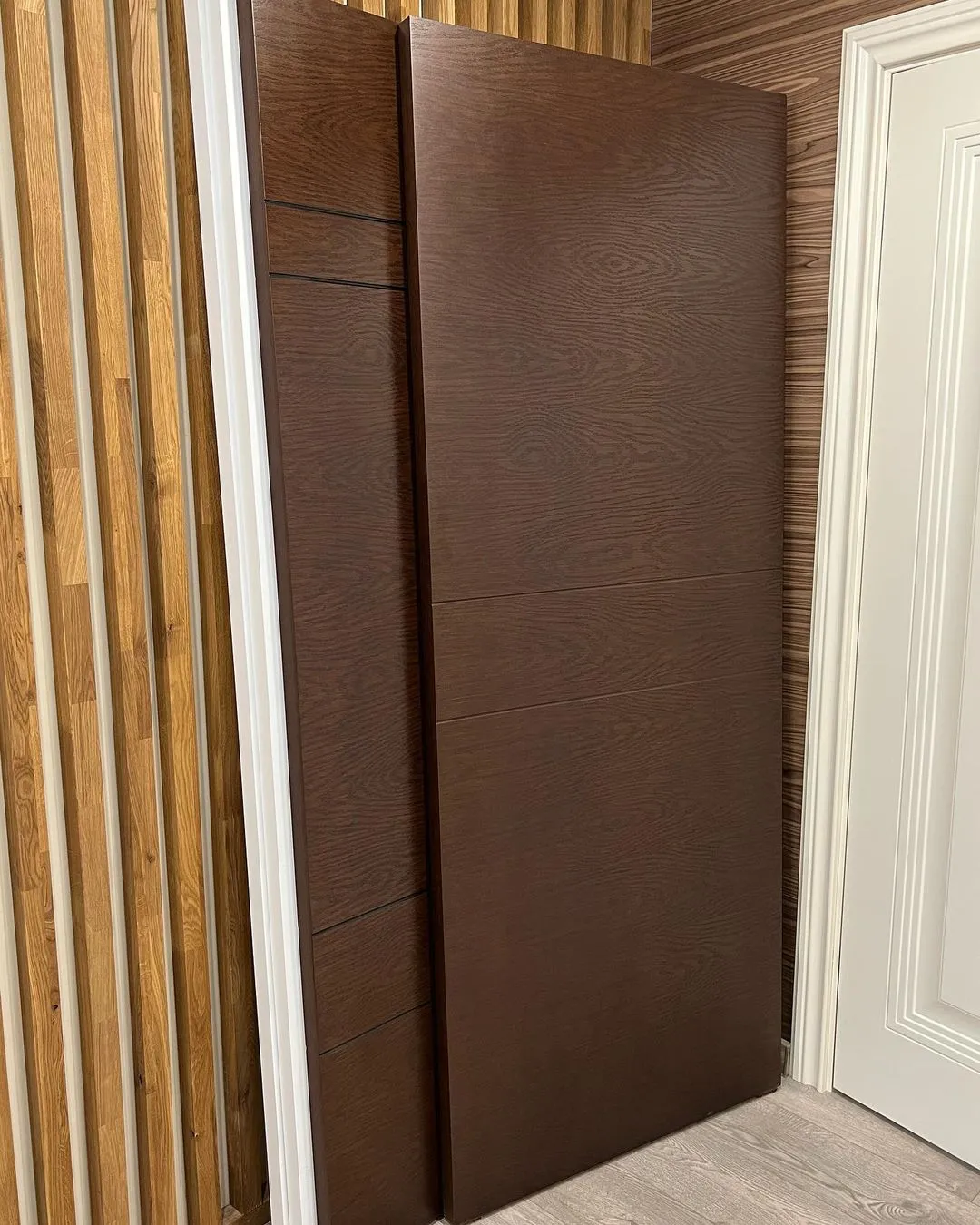 این درب مخفی لوکس با طراحی یکپارچه و استفاده از پنل چوبی تیره، انتخابی بینظیر برای فضاهای مدرن، مینیمال و لاکچری است. ترکیب هنرمندانه دیوارکوبهای اسلیتدار با درب مخفی، جلوهای خاص و منحصربهفرد به فضای داخلی شما میبخشد.