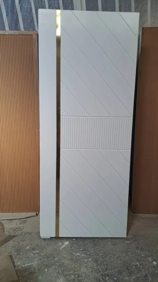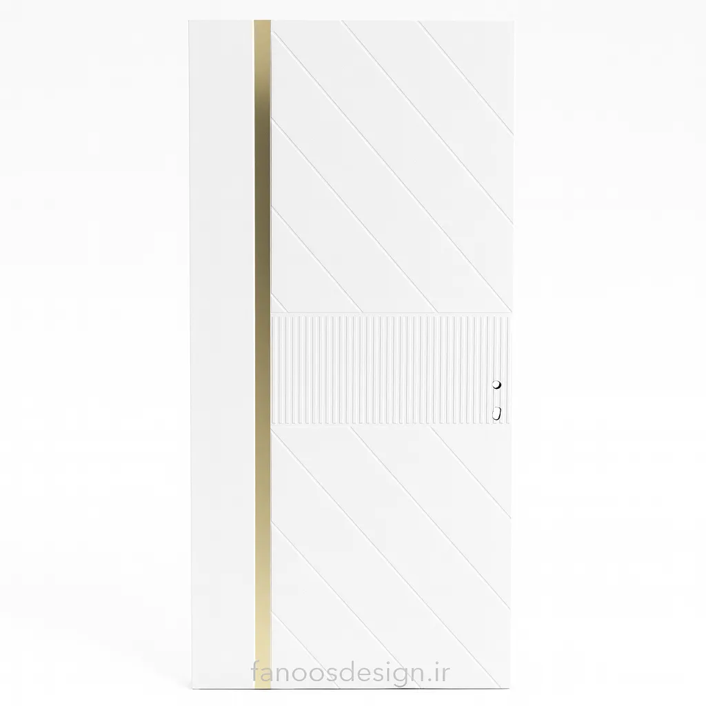 این درب با طراحی خاص خود، انتخابی ایدهآل برای فضاهای روشن و مدرن است. ترکیب رنگ سفید با طلایی باعث میشود فضا لوکستر و چشمنوازتر بهنظر برسد. این مدل هم برای درب اتاقها و هم برای ورودی واحدها قابل استفاده است.