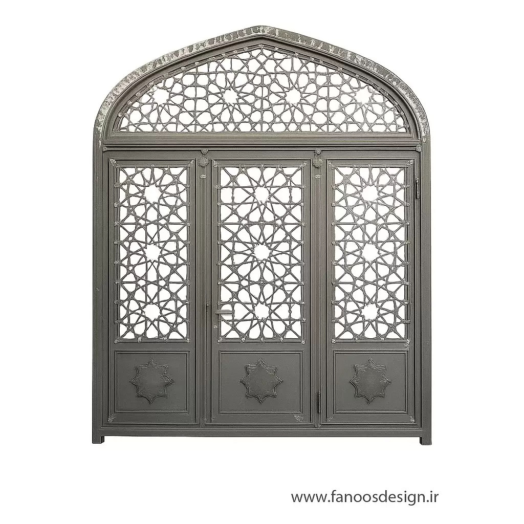 این درب فلزی با طراحی قوسدار و نقوش هندسی الهامگرفته از معماری اسلامی، انتخابی عالی برای ورودی مساجد و حسینیهها است. رنگ طبیعی فلز و جزئیات دقیق مشبک جلوهای اصیل و ماندگار ایجاد میکند.